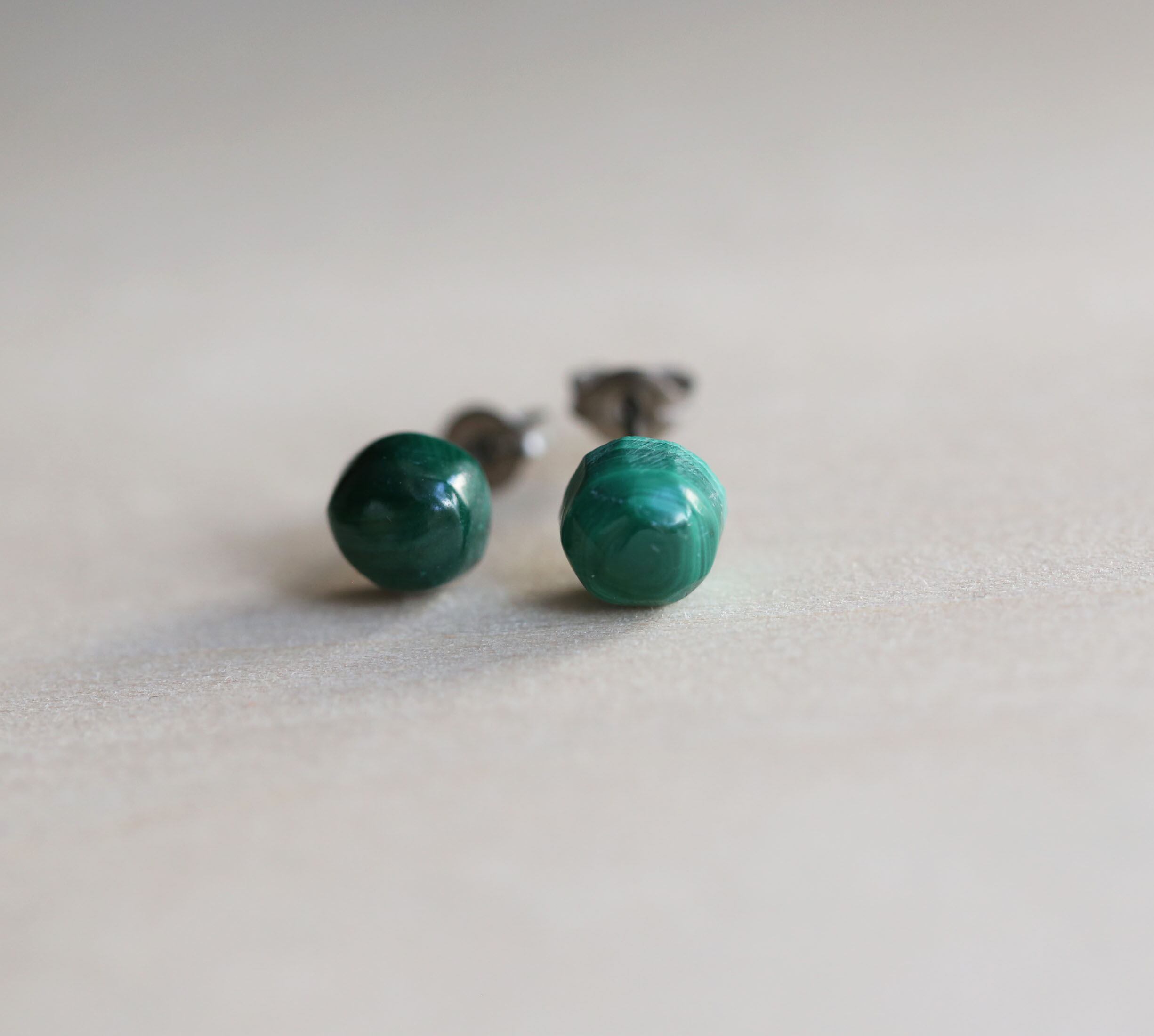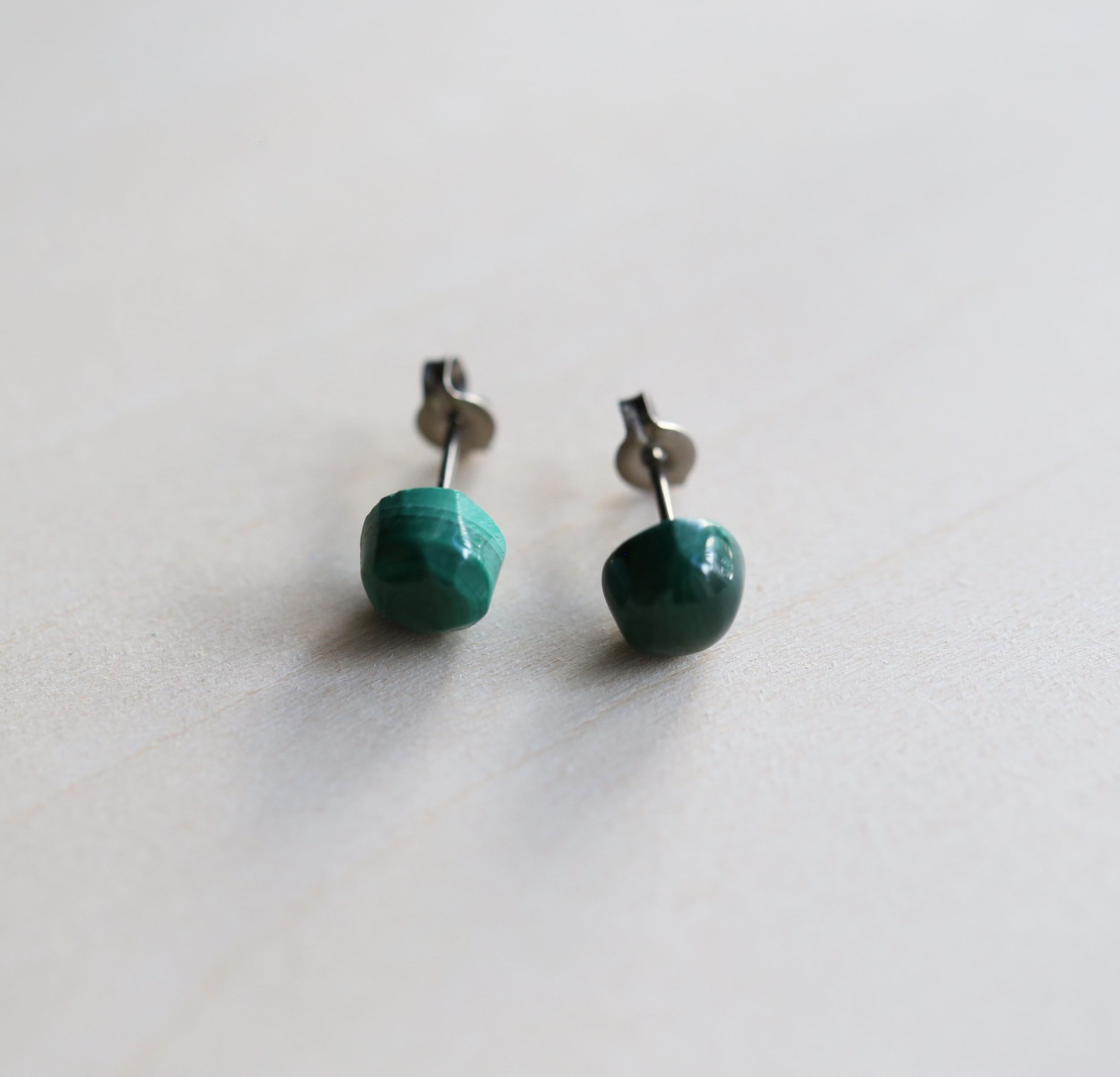 ころりとした小さなマラカイト(孔雀石)をピアスにいたしました。